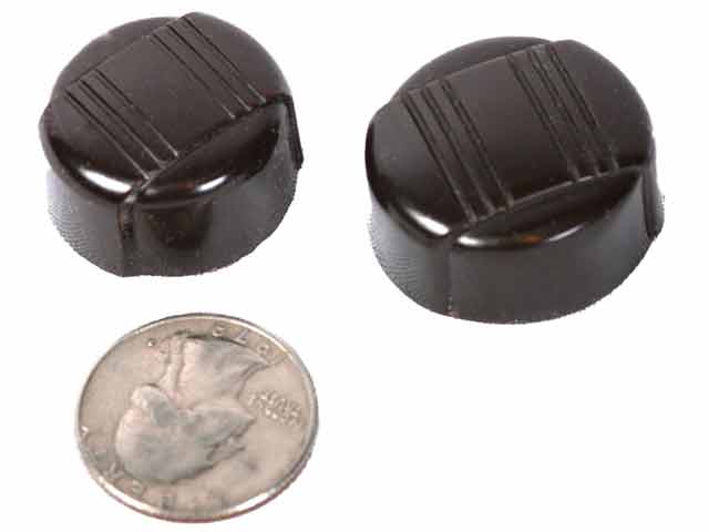 The knobs use a set screw (included with knob) to fix them to a shaft. The smaller knob is just a hair larger in diameter than a quarter. Used by Detrola, Truetone, possibly others. The larger of the two is used mostly on consoles and some table models.