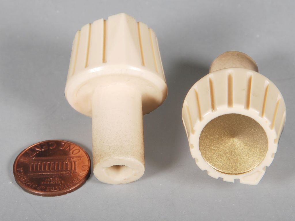 Knob used on Philco Transitone radios, especially "wedge" radios, but many others too. Note: Original knobs had a brass "bright" embedded in the face. These reproductions have aged brass colored paint instead of the brass brights. Price is for one knob.